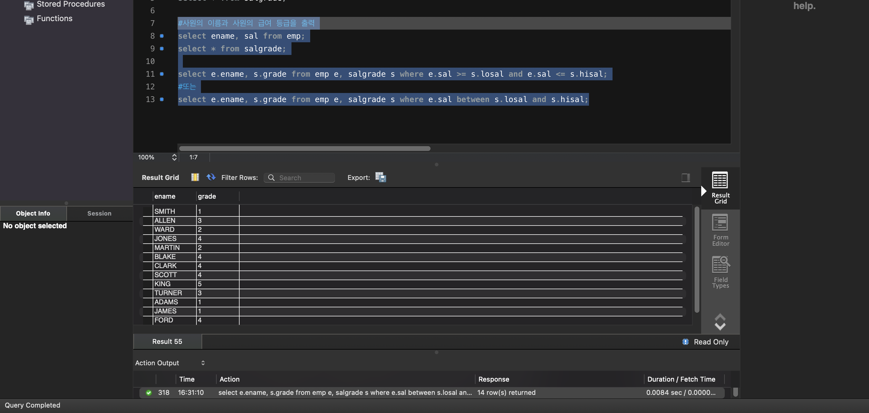 select e.ename, s.grade from emp e, salgrade s where e.sal between s.losal and s.hisal;